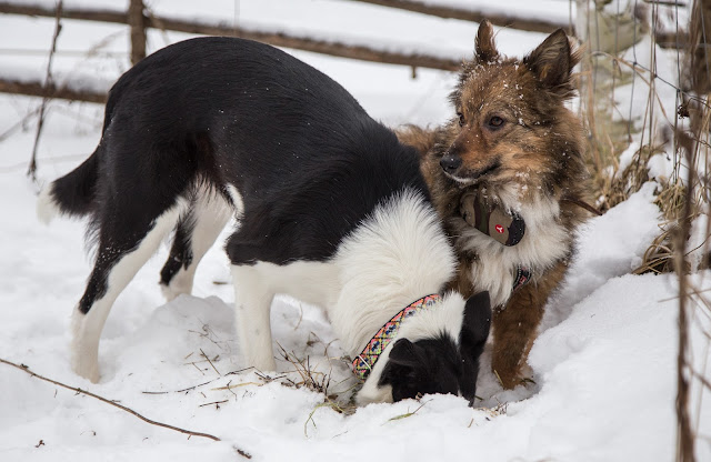 Kiitos asianmukaisten koiriemme, laumaan sopeutuminen on ollut nopeaa. Soosoon varovaisuus ja lievä epäluulo muuttui vuorokaudessa iloisuudeksi ja avoimuudeksi. Koirat näyttävät, missä, miten ja mihin aikaan mikäkin asia meillä tapahtuu. Bordercollie Pöpi ei rodunomaisella tyylillään siedä sekoilua, joten se ilmoittaa jäätävällä tuijottelulla tai hampaiden naksuttelulla että "tääl on vaan yks sheriffi ja se on mä" ja Kikka hoitaa kaveruusasiat. Mutta kyllä Soosoonkin tilanneälyä täytyy ylistää. Se on oppinut nopeasti hyvät, pahat ja rumatkin tavat. Sisäsiisteys on tarhakoiraoletusta parempaa, paperille aina ja ulos mieluiten. Erotilanteissa äänihuulet aukeavat, mutta iltaisin ei enää ollenkaan (jäävät eri huoneeseen) ja aamullakin malttaa paremmin omaa vuoroa odottaa. Laumassa kipuamista on testattu, kuten asiaan kuuluu, mutta sijaa ei ole tullut. Pihalla ulkoillaan aidatulla alueella vapaana, nimeä (huhulua) uskotaan ja hihnassa liikutaan hämmästyttävän hyvin. Vehkosuo-retki viime sunnuntaina, viikko kotiuttamisen jäkeen, testasi luottoa ja uskollisuutta kaikilta osapuolilta. Mutta Free Soosoo operaatio sujui hyvin. Lauma pysyi hyvin kasassa (video retkeltä instagramissa ****).